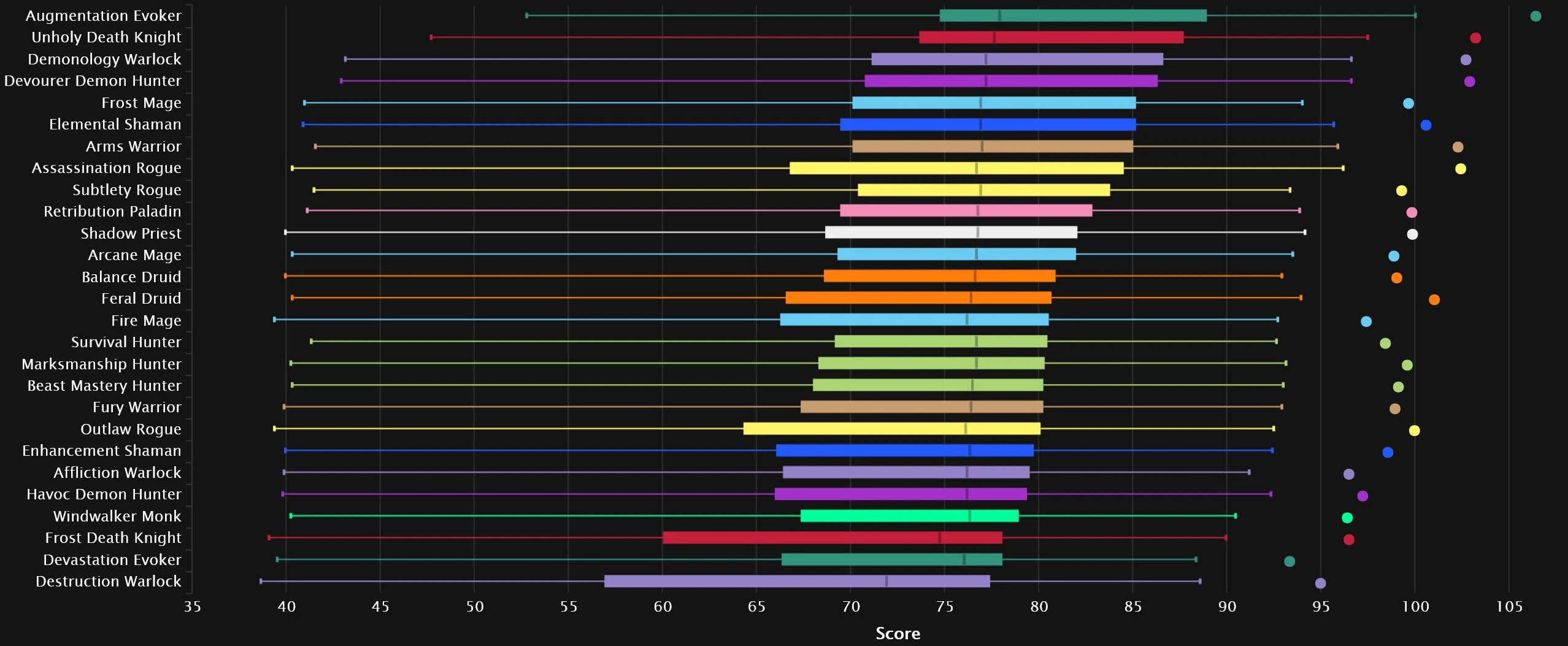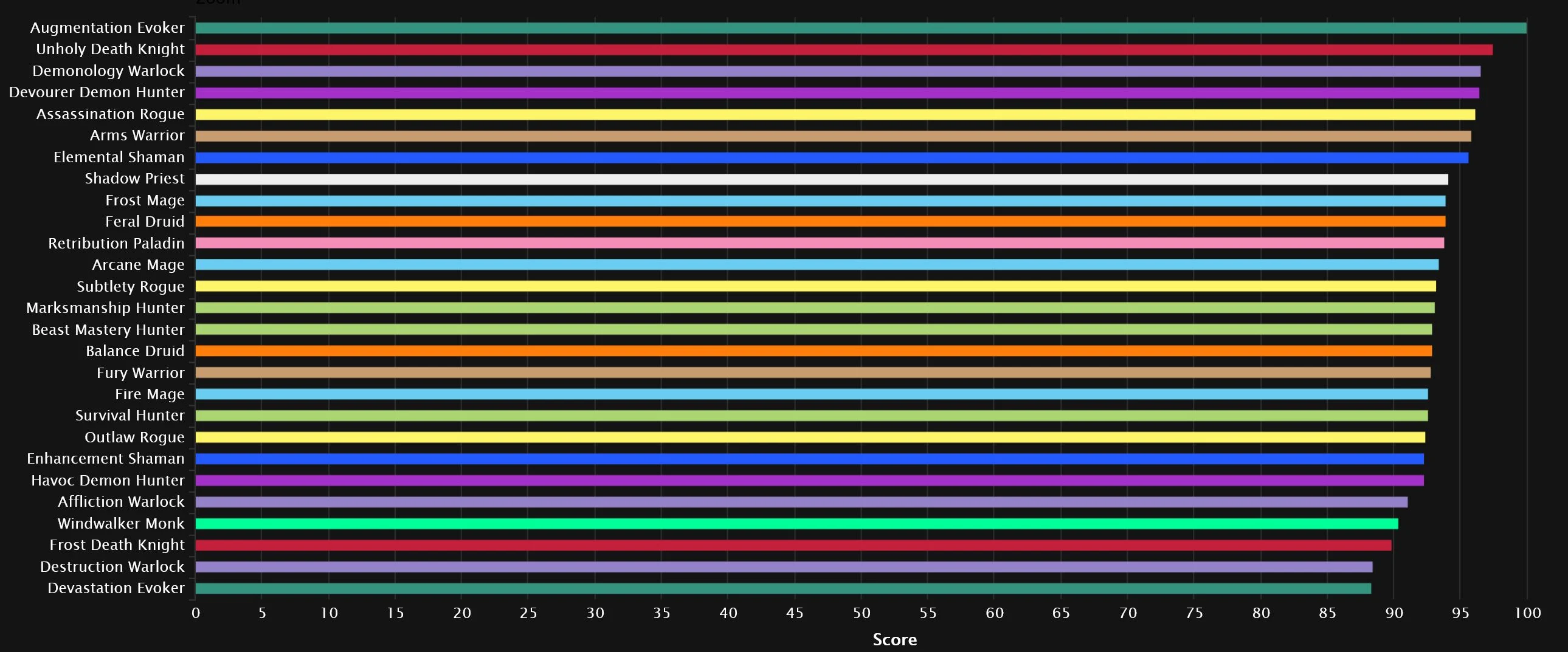 The all percentiles chart looks the same until we get to No.5, where Frost Mage is doing a lot better. Elemental also held on to its early-season performance better here, keeping Arms and Assassination at bay. Subtlety is significantly higher here, along with Retribution, as both kick Shadow out of the top 10.