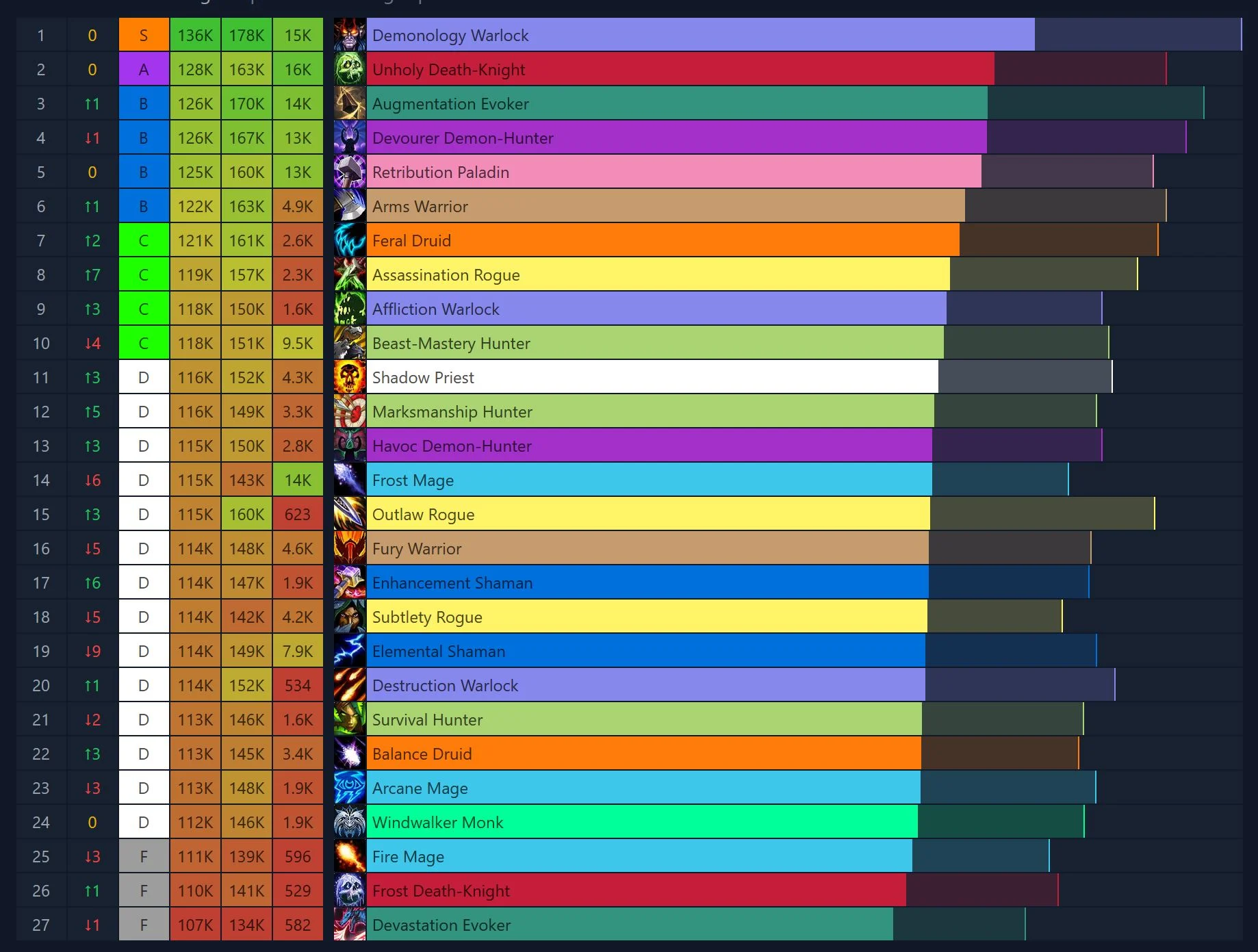 Demo and Unholy remain on top in the damage charts, with the Warlock pulling away from the DK. Augmentation moves up significantly from its early-season spot at the bottom of the top 10, as Fury drops off a cliff this week. Feral is also doing a lot better since the start of the season, as is Assassination, which gains another 7 spots this week.