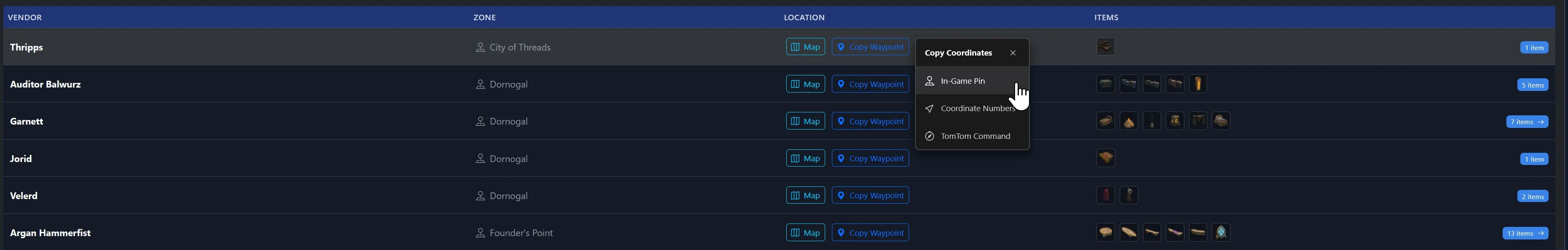 But that’s not all, as it also has the vendors’ exact locations, including coordinates, TomTom commands, and in-game pin!