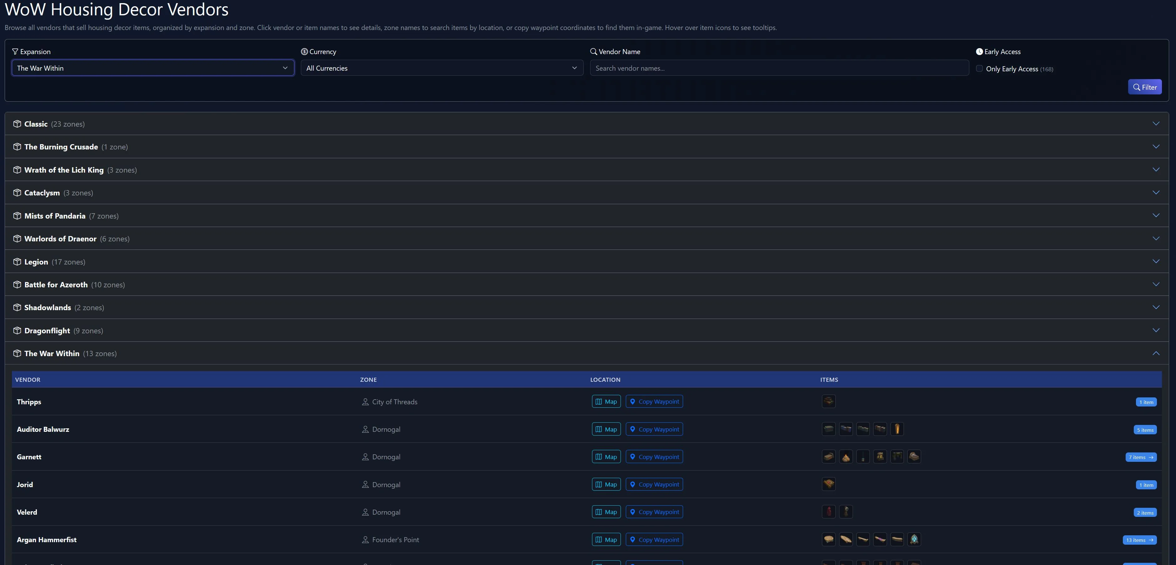 As rahuonn reminded us, WoWDB has a special page featuring all the available Housing vendors! It has all the items the vendor sells, with links to the databases entry on the items. There’s also filters for individual expansions and what currency you buy the items from, as well as whether the items/vendors are available in this Early Access part of the system!