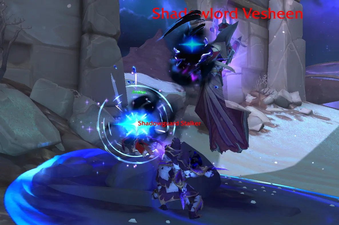 After travelling to the Fracture of Laacuna in the north of K’aresh, you and Arator find “Alleria” who is scouting a Shadowguard camp and ignoring your presence. When you try and get her attention, it turns out that Alleria had set a trap that only looked like her, in order to try and capture and ambush Shadowlord Vesheen. Setting off the trap does make Alleria appear, which surprises her when she sees it’s us. She recruits us to help her capture the Shadowlord, so we can learn about what his orders are from Salhadaar and what he knows about Xal’atath.