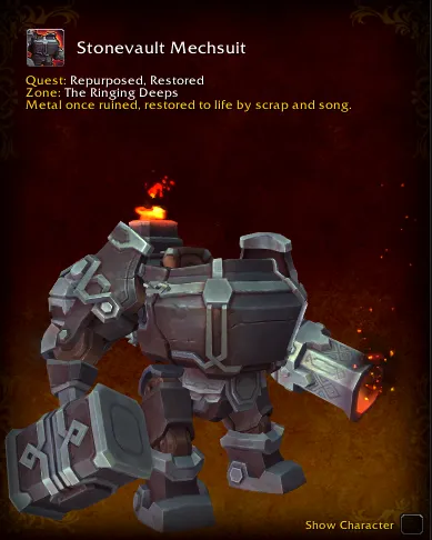 Stonevault Mechsuit, from the Stonevault dungeon. This mount was originally only obtainable through Season 1 of The War Within. This mount is a little different from other dungeon mounts, as it is not a direct drop from the final boss.