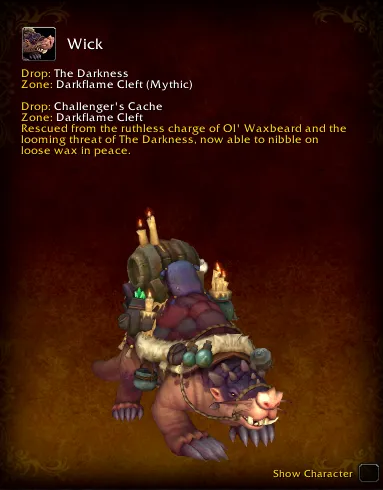 Wick’s Lead, from the Darkflame Cleft dungeon. This mount was originally only obtainable through Season 2 of The War Within. Unlike the Stonevault Mechsuit, this mount is a direct drop from The Darkness, the final boss in the dungeon.
