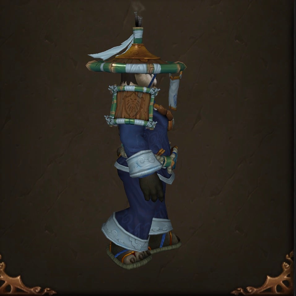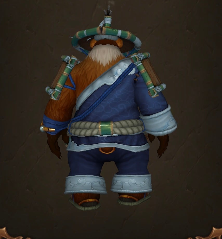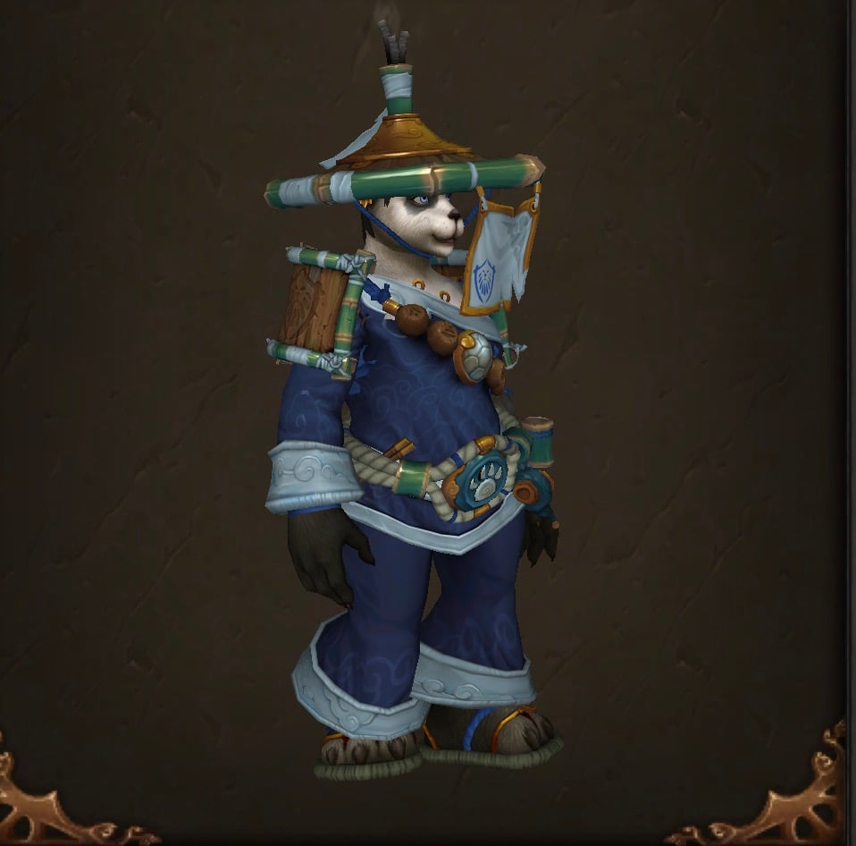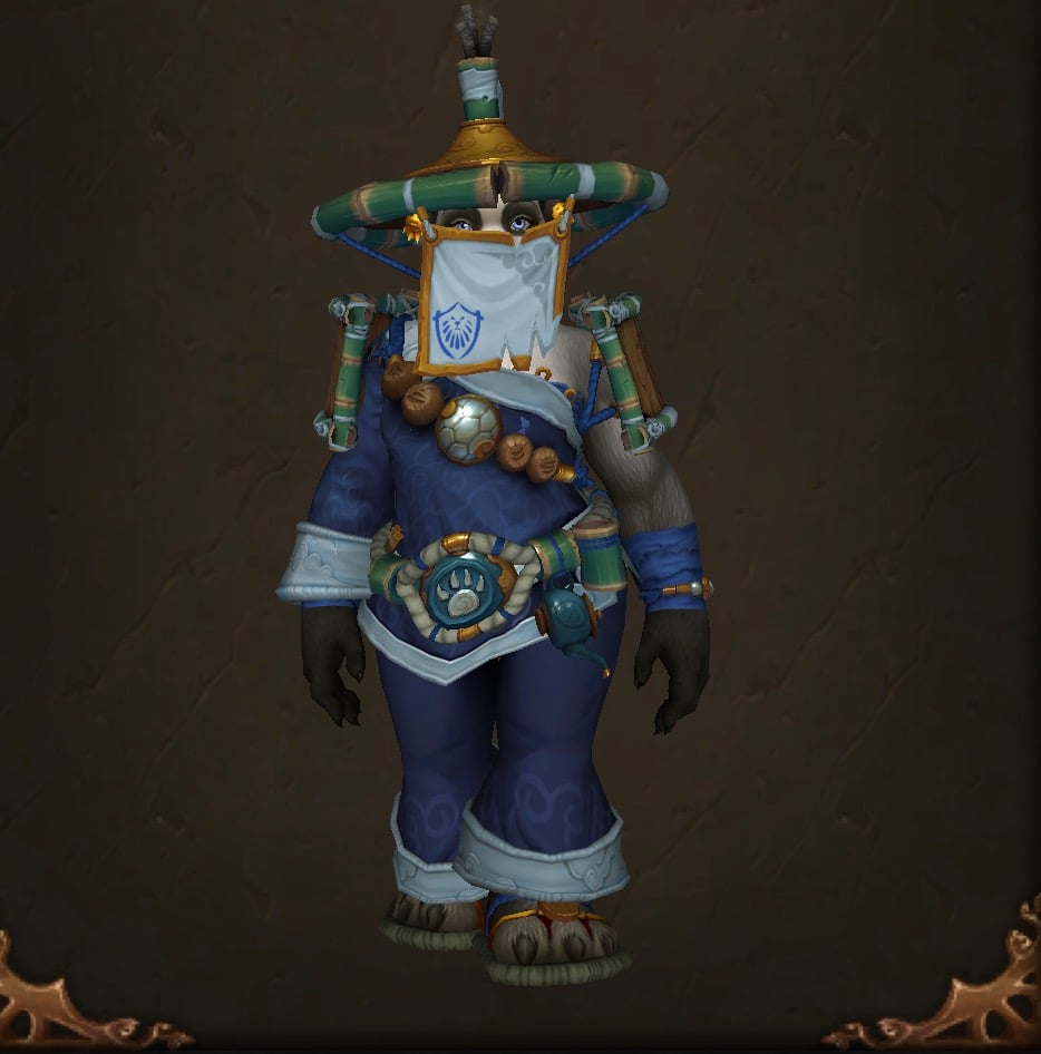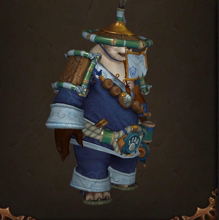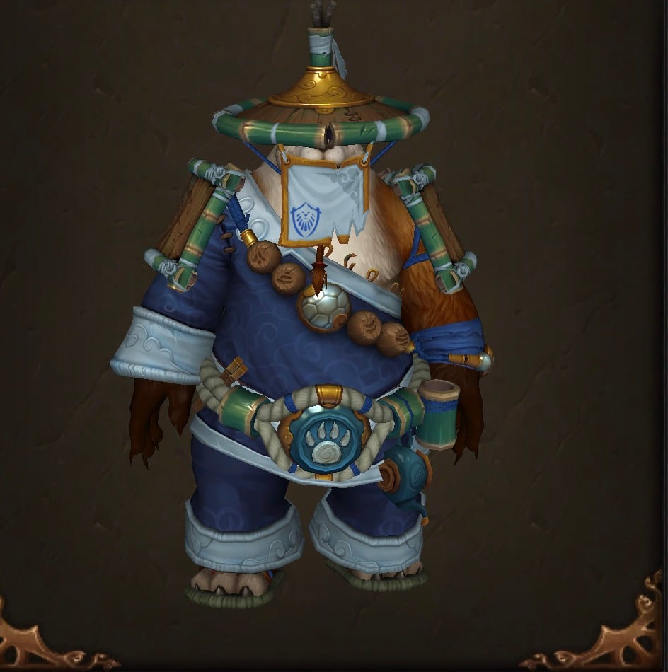 Here’s the Tushui Heritage Armor set for the Pandaren who play Alliance. As you can see, it features distinct blue faction features.