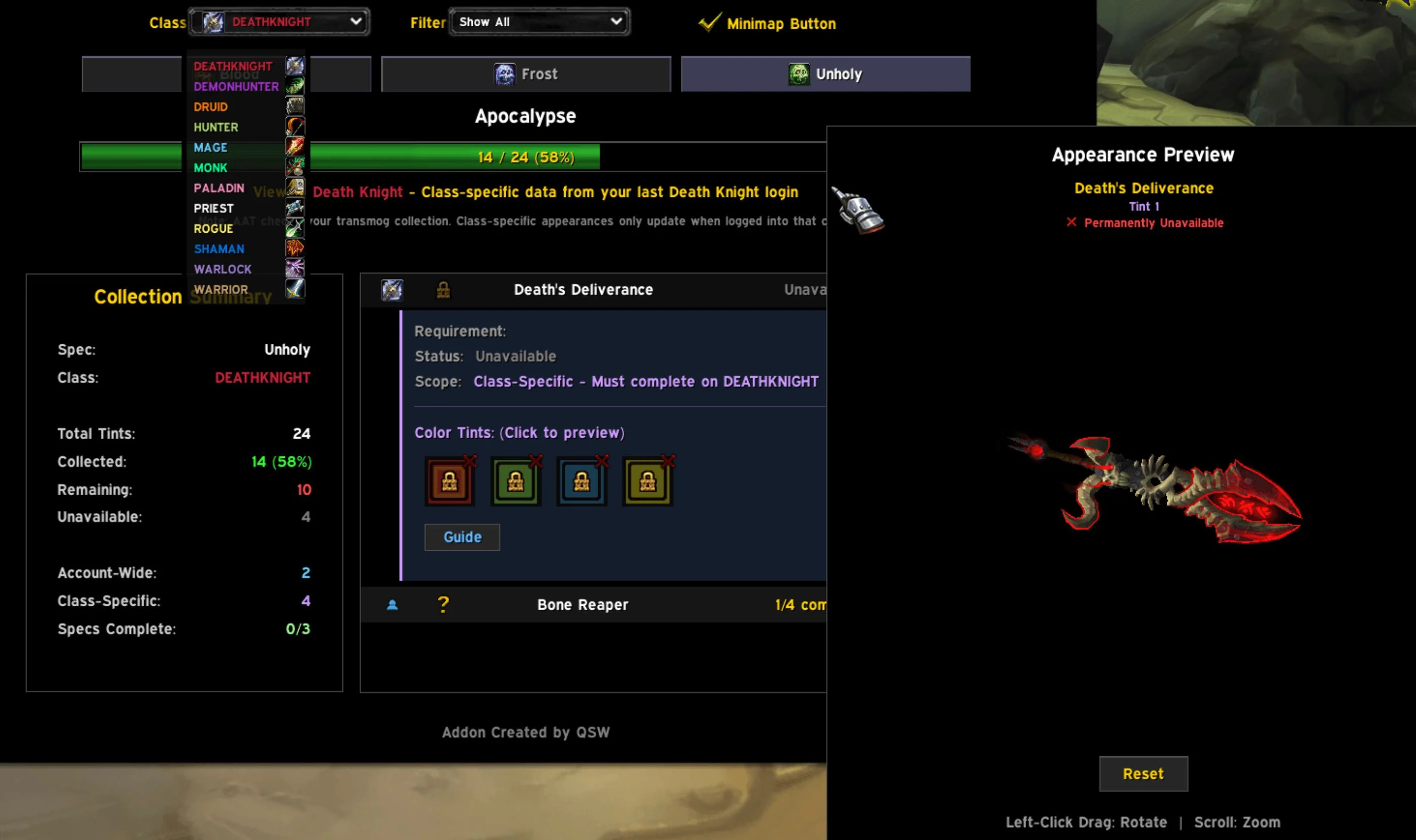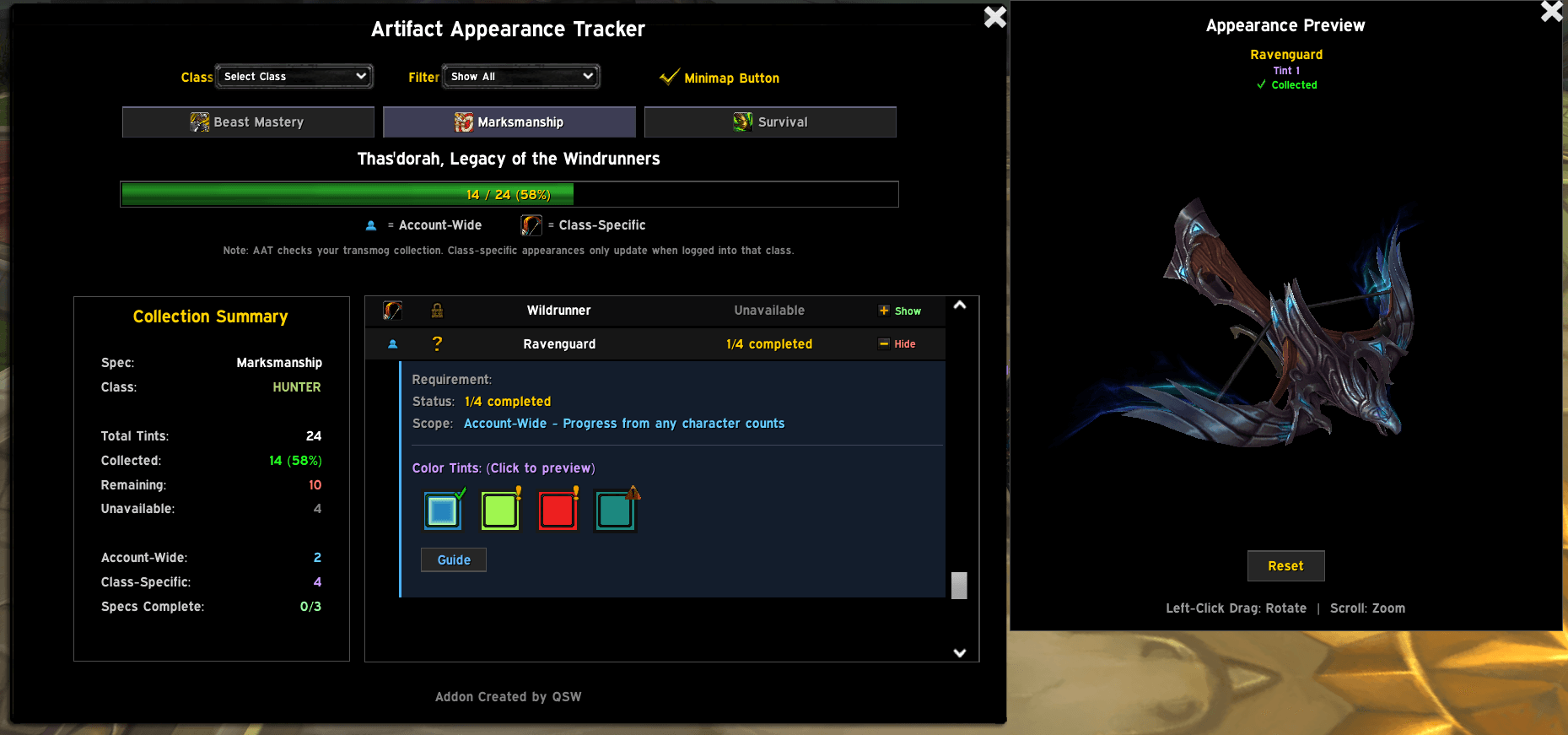 Qsw_ went down a deep Legion artifact rabbit hole. Emerging from it, they managed to create an incredibly useful tool for players who want to fill out their collections. Artifact Appearance Tracker, or AAT, does exactly what it says. It shows you each class’s artifact, its hidden appearances, and all the tints for them all! It then shows you your current progress on each, with a preview of the look itself. And yes, the progress is checked account-wide!