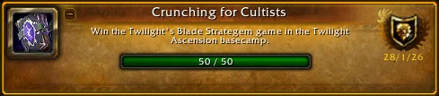 Crunching for Cultists, you must win the Twilight’s Blade Stratagem game in the Twilight Ascension basecamp 50 times.