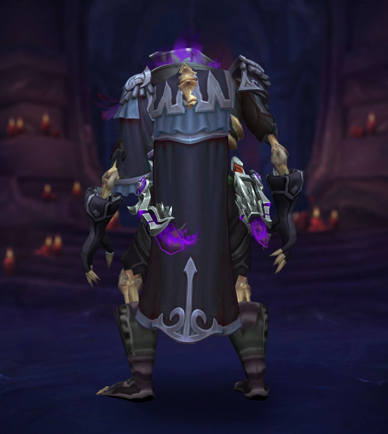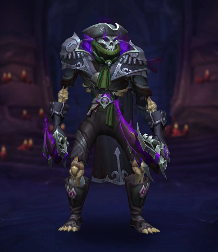 With the launch of Midnight, you can purchase The War Within Gladiator Ensembles for 12 Marks of Honor. Here’s a relatively simple set playing into the undead pirate theme without going too heavy on a monochrome purple look caled the Umbral Saboteur set.