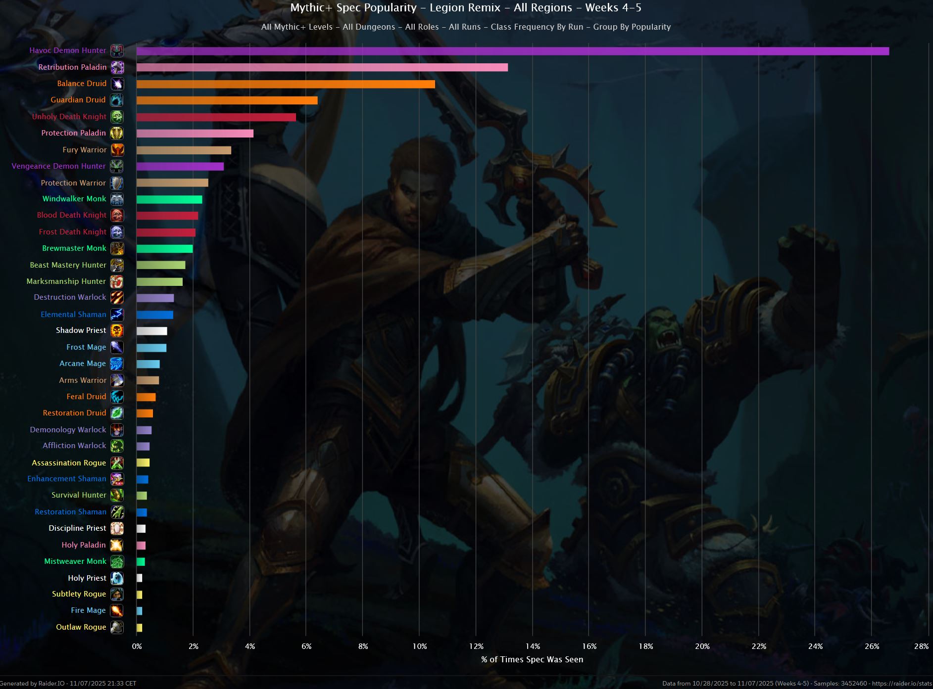 Havoc has crossed the one-quarter of all runs threshold, coming in at 26.6% of all runs completed! All the top specs gained a whole lot of ground as well, with Ret gaining 2.2% of the players, and Balance 2%, at 12 and 10%, respectively. And so the top 3 specs make up just shy of half of all runs made in Remix.