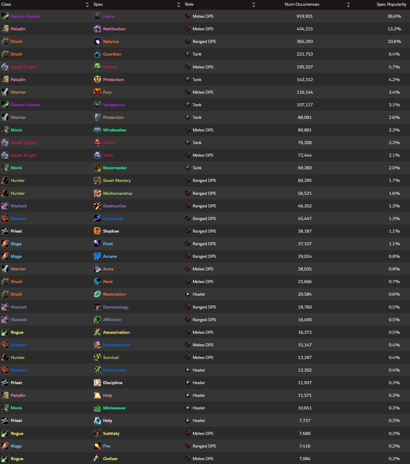 The data used in this article comes from Raider.IO‘s excellent analytics tools, taking into account all Mythic+ runs across all levels of play. The data is focused on this past reset and not on the season as a whole.