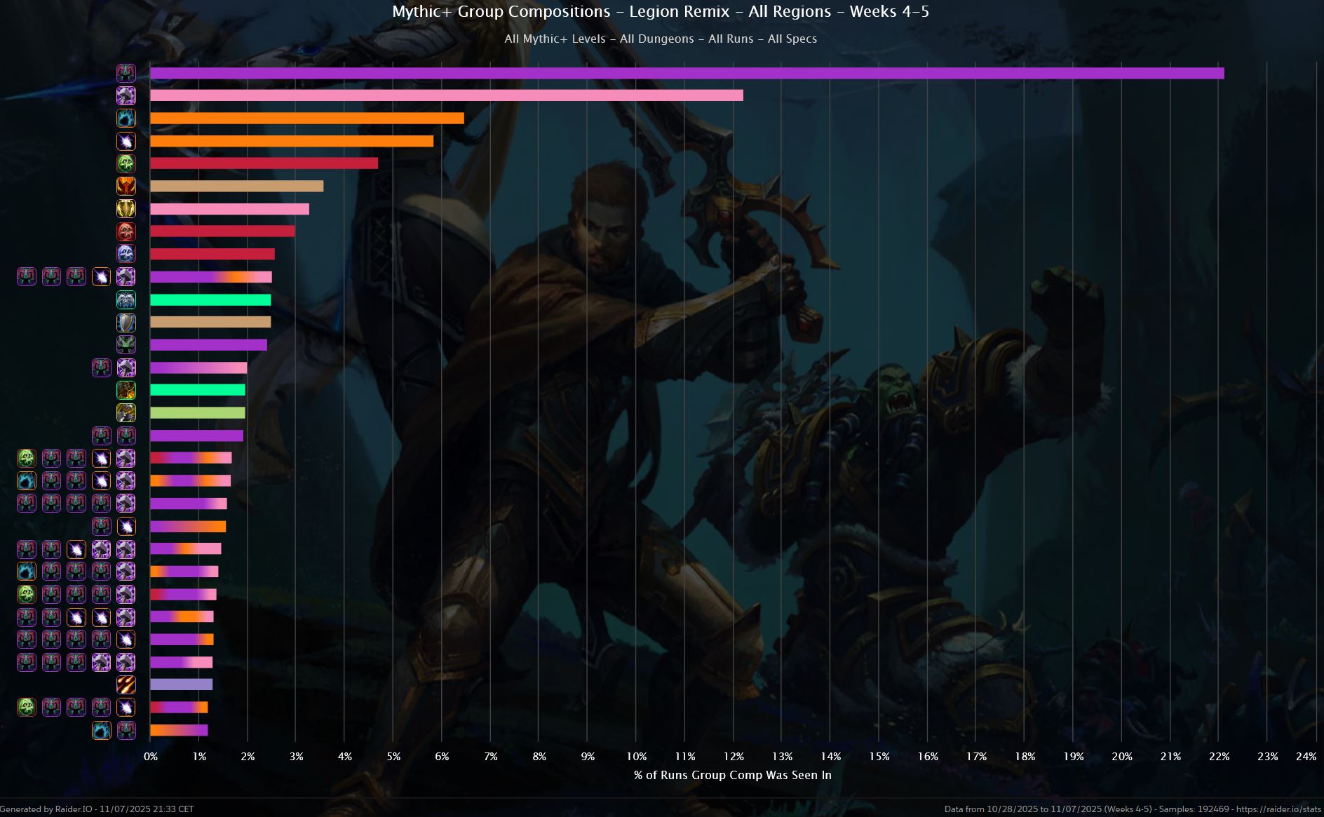 We have a very chunky one this week, as we dive into both retail’s population and DPS logs, as well as Legion Remix’s numbers! Beast Mastery is continuing its domination of retail and then some, while Havoc still very much does a giant portion of runs in Remix. The DH, Paladin, and Druid actually make up just slightly shy of half of all runs made in Legion! But first, let’s start off with the retail numbers.