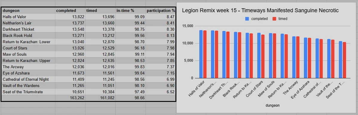 The split across all dungeons shrank in the final week. The participation spread between the most and least popular dungeon decreased by 0.6 percentage points. Their order remained unchanged. The overall success rate jumped back up after a terrible previous week. An increase of 1.04 percentage points brought it to 87.63%. The affix combination was beneficial for all dungeons.