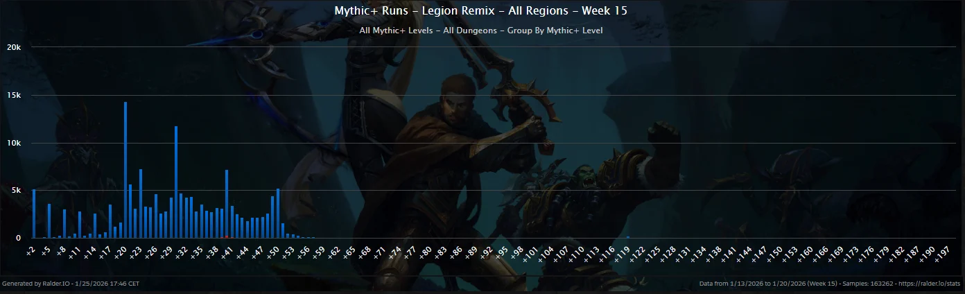 Remix has concluded, and its final M+ week saw a drop of just 3.12%. This value might even bounce up into the positives, because RaiderIO’s data crawlers for Remix numbers do not reach the same level of accuracy as fast as with Retail data.