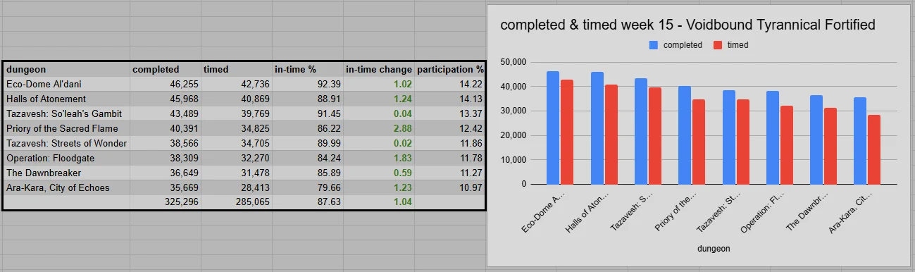The split across all dungeons barely moved during the final week. The awful Sanguine and Necrotic affix combination turned dungeons with narrow passages into a bad experience. It is still concerning that Seat of the Triumvirate left a rather bad taste in the mouths of many players. We can only hope the redesign for S1 of Midnight is received more favorably and doesn’t leave it dead last, as we saw with City of Threads in TWW S1.