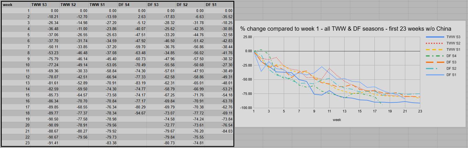 The global drop-off of 10.86% is well within the range for regular weeks towards the tail-end of a season. Previous seasons’ final weeks would usually show much larger decrements of 30% or even higher. And the global value was once again skewed by the regional differences. In China, the trend away from Retail continued. With -15.43%, we saw a value similar to the one in the previous week. Meanwhile, the four regular regions only dropped by 7.99%.
