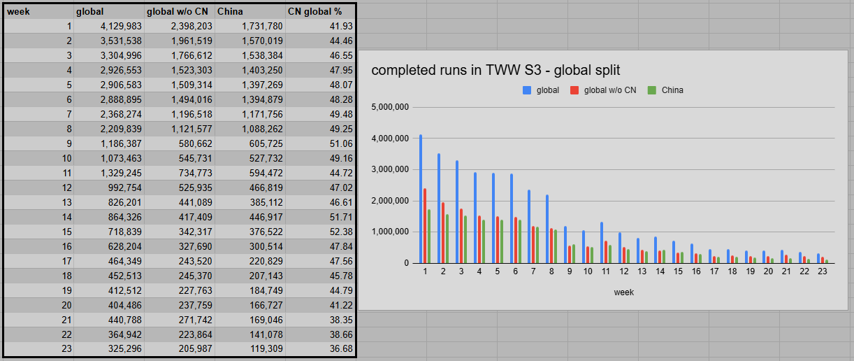 68.81% of all keys were completed at key level 10 or higher. Level 10 was once more the dominant key with 23.45%. The lower keys did not see major shifts, besides a slight bump for level 2. A lot of players probably used their freshly converted Remix characters for a few quick gear upgrades. The largest shift in focus happened at key level 13, the preferred level to secure a 3,000 rating. While almost all key levels besides the top three saw fewer total runs, the absolute value for level 13 increased by 6.49%. In relative share, this key level increased by a whopping 19.15%. Key levels 21 to 23 finished with record numbers of weekly runs for the season. Almost half of all timed +23s this season were done in the final week alone.