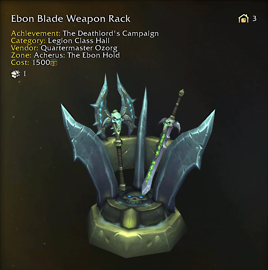An epic display of rune weapons will fit perfectly in a dark fantasy armory. The Ebon Blade Weapon Rack is unlocked by completing the Death Knight Class Hall campaign and costs 1,500 Order Resources.
