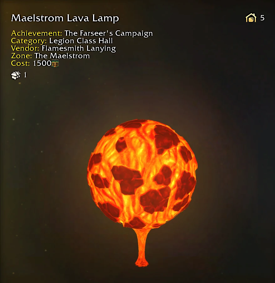This massive ball of magma can be a prominent source of light or an accent in a volcanic lair, filling cracks. The Maelstrom Lava Lamp is unlocked by finishing the Shaman Class Hall campaign and costs 1,500 Order Resources.