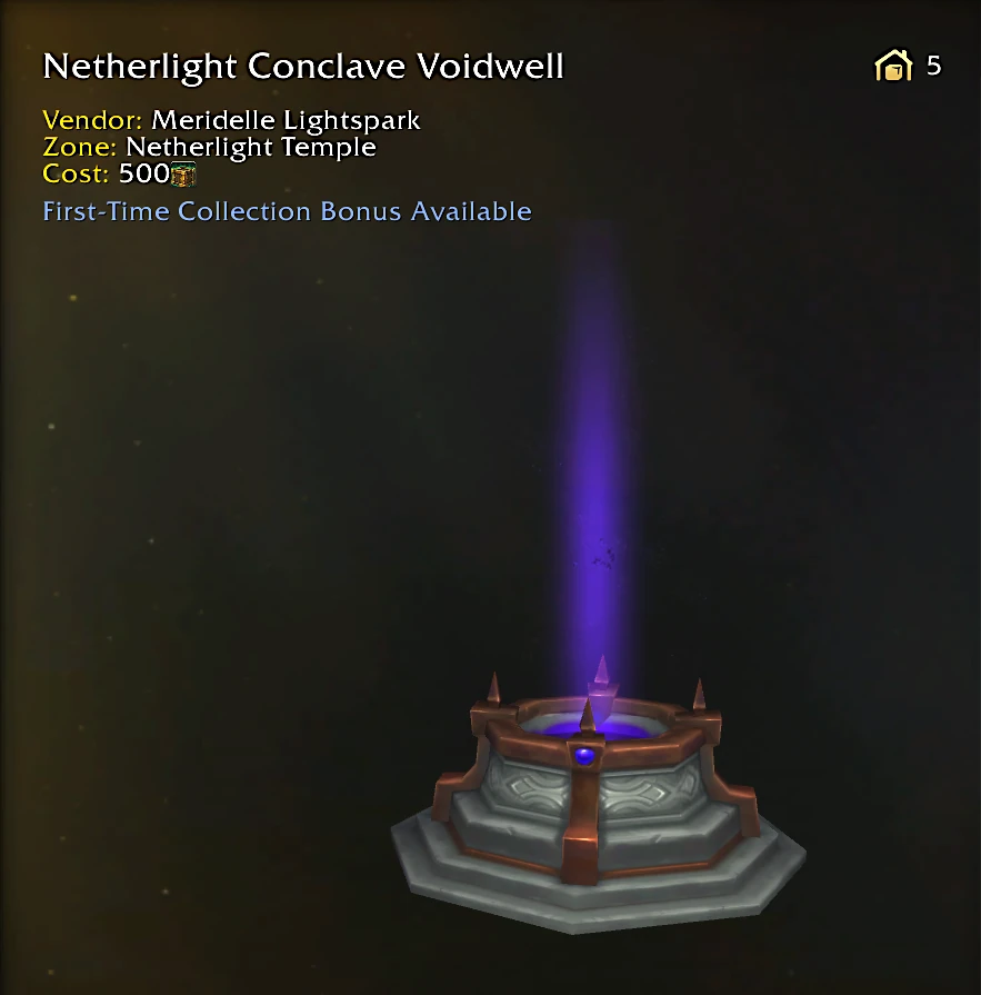 This decor provides an ominous purple beam of light with unstable void particles that could be used to create an epic display or ominous atmosphere. Purchase the Netherlight Conclave Voidwell for 500 Order Resources.