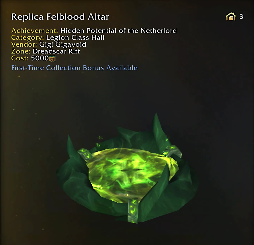 This fiery green decor offers fantastic effects and sets a diabolical vibe fit for any fel-infused hideout. The Replica Felblood Altar requires the Hidden Potential of the Netherlord achievement earned by unlocking a hidden artifact appearance with a Warlock and costs 5,000 Order Resources.