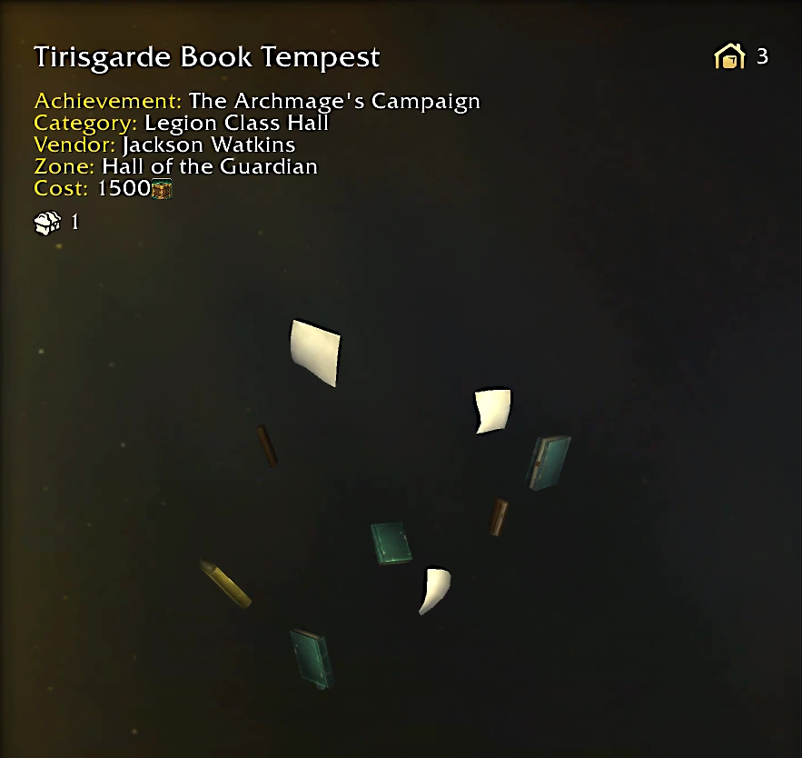 Firstly, an eye-catching favorite, this decor instantly creates a magical atmosphere in any room. Players unlock the Tirisgarde Book Tempest after completing the Mage Class Hall campaign and can purchase it for 1,500 Order Resources.