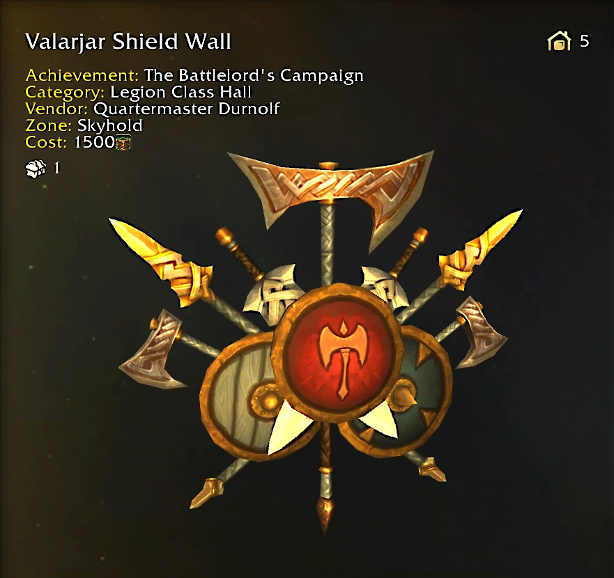 A glorious centerpiece of Skyhold weapons, this decor commands attention and offers a preview of the types of displays players are sure to come up with as more individual weapons come to housing. The Valarjar Shield Wall is unlocked by finishing the Warrior Class Hall campaign and costs 1,500 Order Resources.