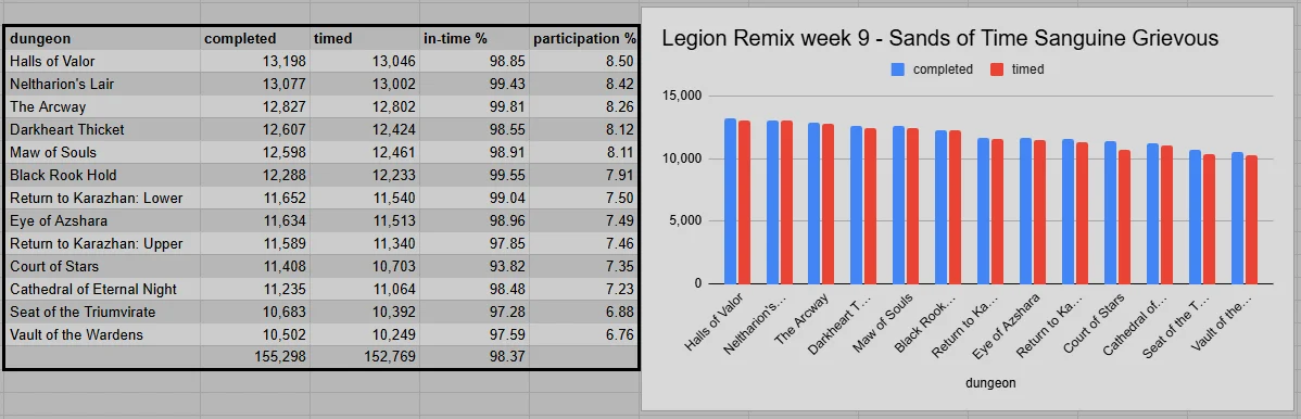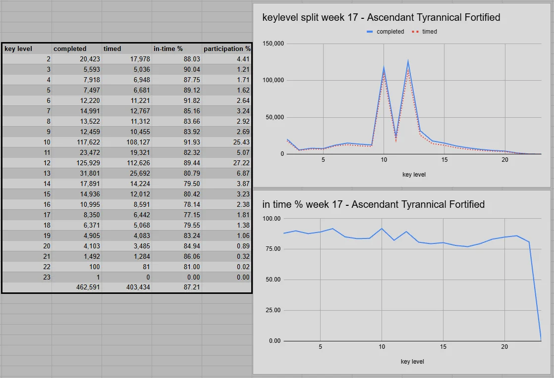 The split across all dungeons barely changed, while their order shifted a bit from the previous week. The bottom five have long been plagued by excessive running, dead-end boss layouts, and overly long RP. And this week, the success rate for Court of Stars was particularly low. Depleting 6.18% of all keys is significant. But the affix combination of Sanguine and Grievous was also punishing.