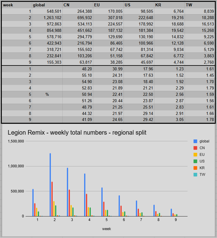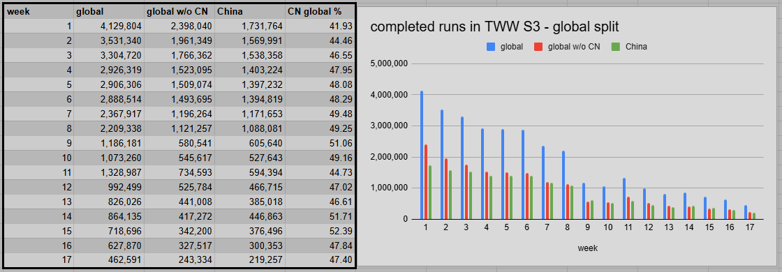 As of this writing, 120 hours after the US reset, hourly numbers for the main regions are slightly ahead in the EU and US, and slightly behind in CN. This is also tied to a rebound compared to really low participation in the first days of week 17. For Remix, this effect is much larger, with possibly 40-50% more runs for EU and US. But that is a topic for the next breakdown.