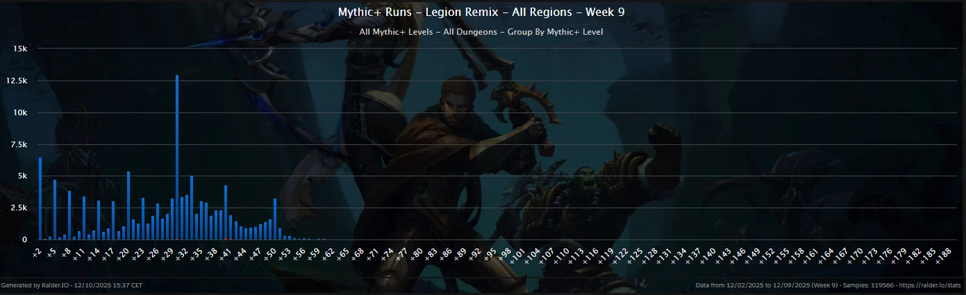 Housing dominated player attention that week. And we might see a slight rebound from that before the holidays. Content and rewards surrounding this feature will ramp up once Midnight starts. We still have no hints at decor rewards from M+, which could impact long-term participation. But the most recent Beta Build also brought some changes to the vault rewards, which benefit players that go beyond just filling their +10s or +12s. Pushing to key level 18 will increase the vault item level in Midnight S1 up to Myth track 4/6.