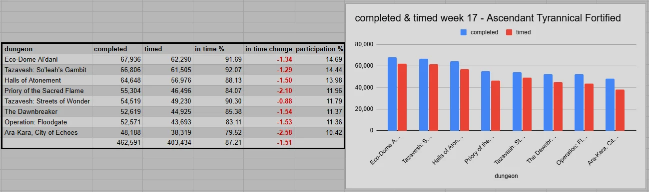 The split across all dungeons widened again. Ara-Kara fell far behind once again. The order of dungeons barely changed, except for a swap of ranks 6 and 7. Overall, the success rate dropped by 1.51 percentage points to 87.21%. The biggest impact clearly stems from the Ascendant affix, which will receive a major nerf in Midnight Season 1.