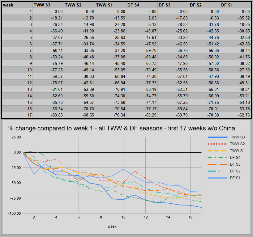 Remix saw yet another cut, once again loosing roughly one-third of its numbers. However, following the final minor update for Remix in week 18, or week 10 of its cycle, activity for the current week has increased again. Next weekend’s article will cover this development.