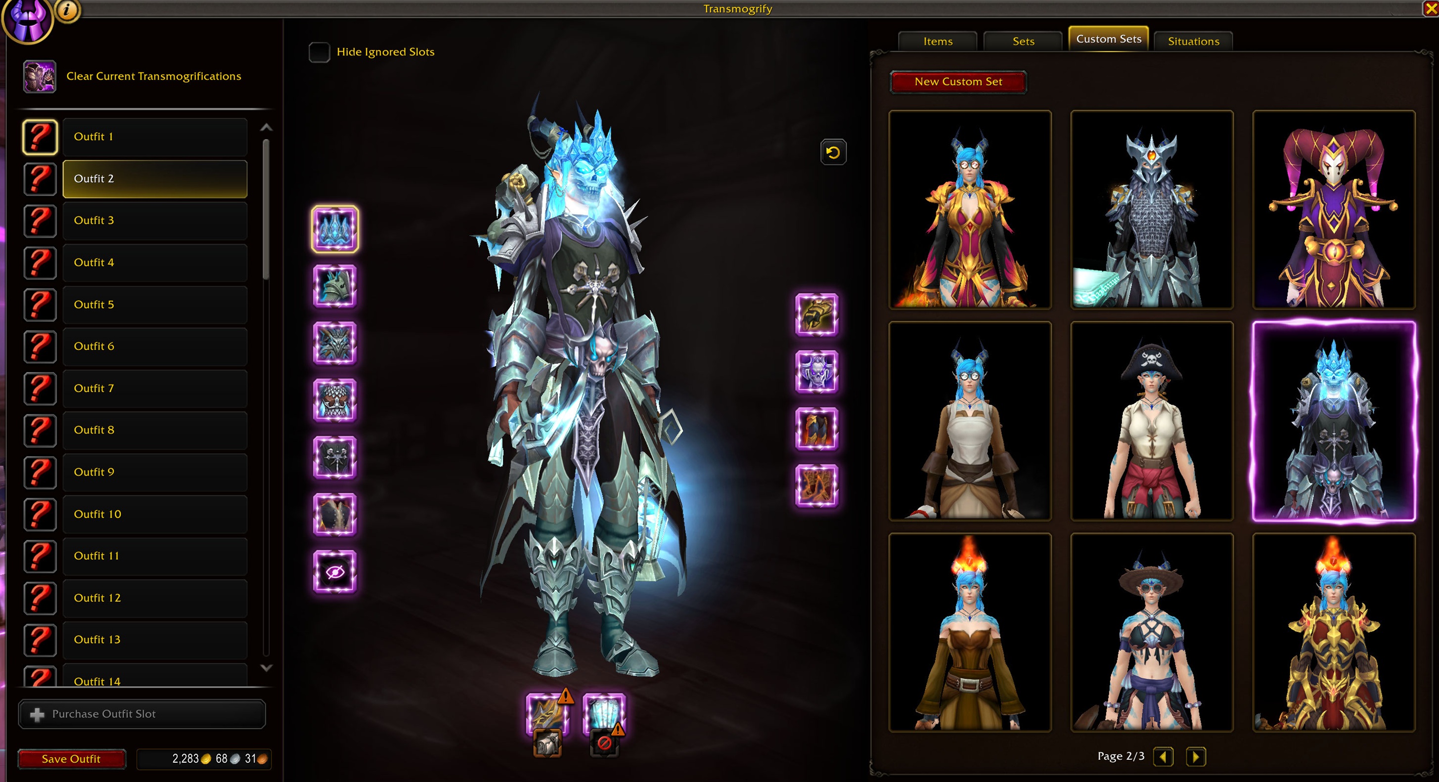 As part of the Transmog system, you can have up to 50 different outfits saved. The first two are free, but each outfit saved after costs gold. Below is a table showing the different costs of each outfit slot from 1-50.