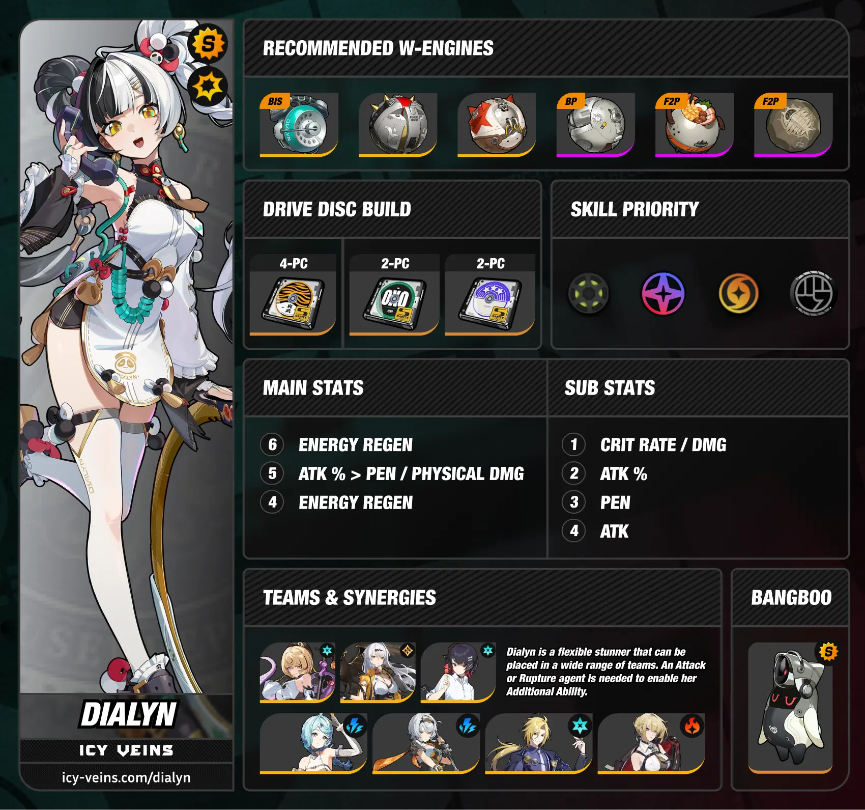 Dialyn is an S-Rank Physical Stun Agent in Zenless Zone Zero. Our Dialyn guide and best builds cover everything you need to know about Dialyn's best builds, including skills, drive discs, team compositions and more. To learn more about Dialyn, use the tabs above to switch to our build information for Dialyn or her team compositions.
